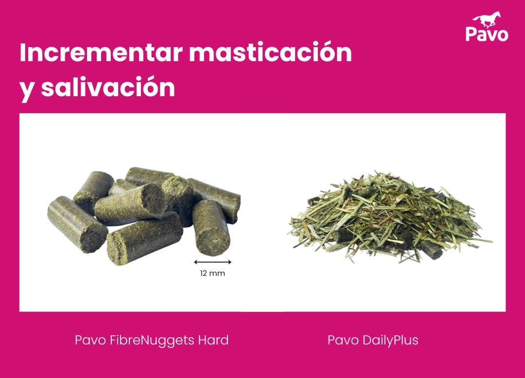 - Mezclando el pienso habitual con piensos que prolonguen el tiempo de masticación. Son piensos a base de mezclas de forraje y por lo tanto altos en fibra.En Pavo tenemos Pavo DailyPlus o Pavo FibreNuggets Hard